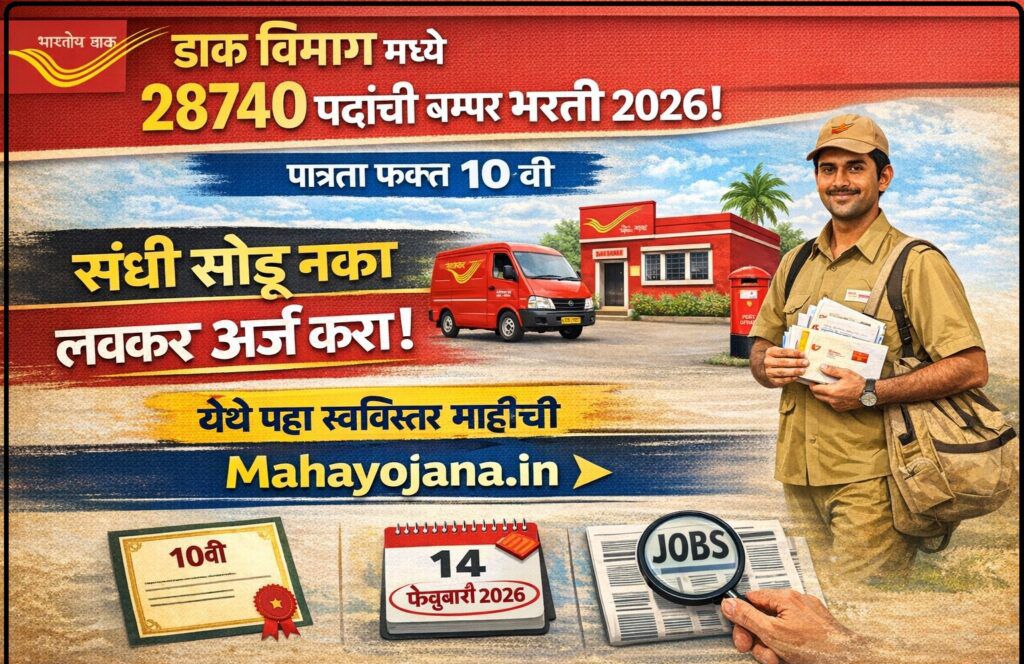India Post GDS Registration 2026- (भारतीय डाक विभाग) मार्फत Gramin Dak Sevak (GDS) Mega Recruitment 2026 अंतर्गत देशभरात 28740 पदांची मोठी भरती जाहीर करण्यात आली आहे. विशेष म्हणजे महाराष्ट्र राज्यासाठी 3553 पदे उपलब्ध आहेत.ही भरती 10वी पास उमेदवारांसाठी एक सुवर्णसंधी असून अर्ज प्रक्रिया पूर्णपणे ऑनलाइन आहे. जर तुम्ही सरकारी नोकरीच्या शोधात असाल तर ही भरती … Read more