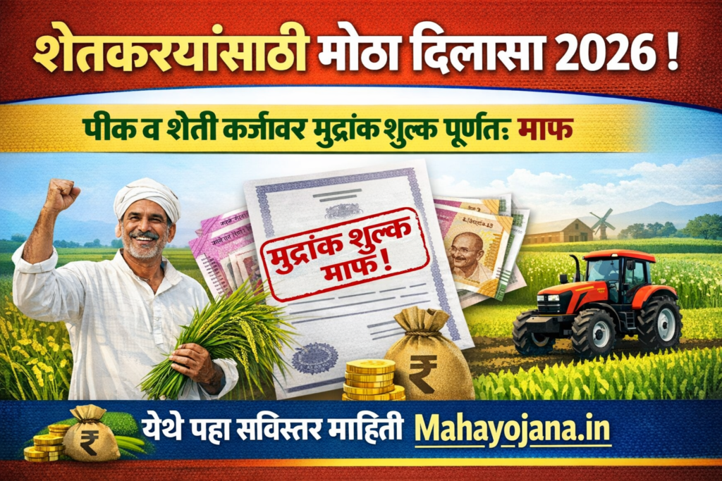 Crop Loan 2026 New Update – (Crop Loan Stamp Duty Decision – Government Gazette Update)शेतकऱ्यांच्या आर्थिक ओझ्यात दिलासा देणारा एक अत्यंत महत्त्वाचा निर्णय महाराष्ट्र शासनाने घेतला आहे. शेती व पीक कर्जाशी संबंधित २ लाख रुपयांपर्यंतच्या व्यवहारांवरील मुद्रांक शुल्क १ जानेवारी २०२६ पासून पूर्णतः माफ करण्यात आले आहे. या निर्णयासंबंधीचे अधिकृत शासन राजपत्र (Gazette Notification) प्रसिद्ध झाले असून, यामुळे राज्यातील लाखो शेतकऱ्यांना थेट आर्थिक फायदा होणार आहे. Crop Loan 2026 New Update